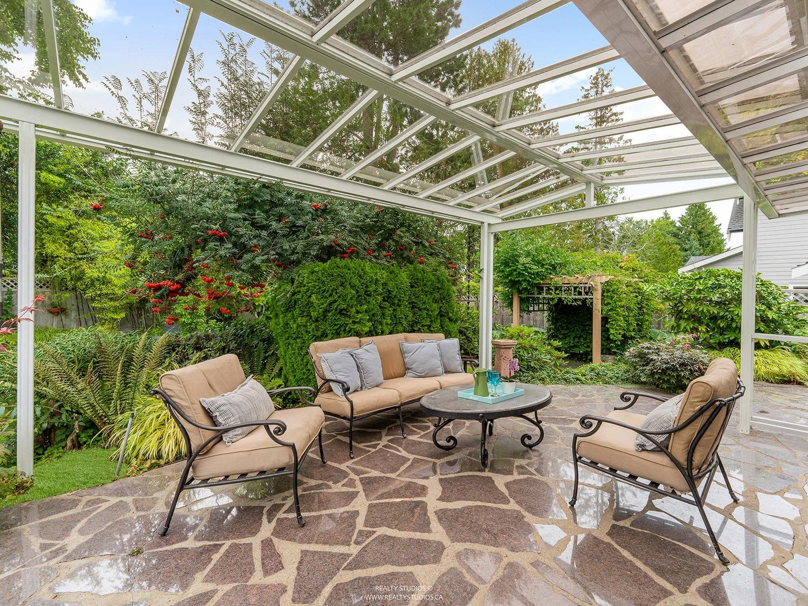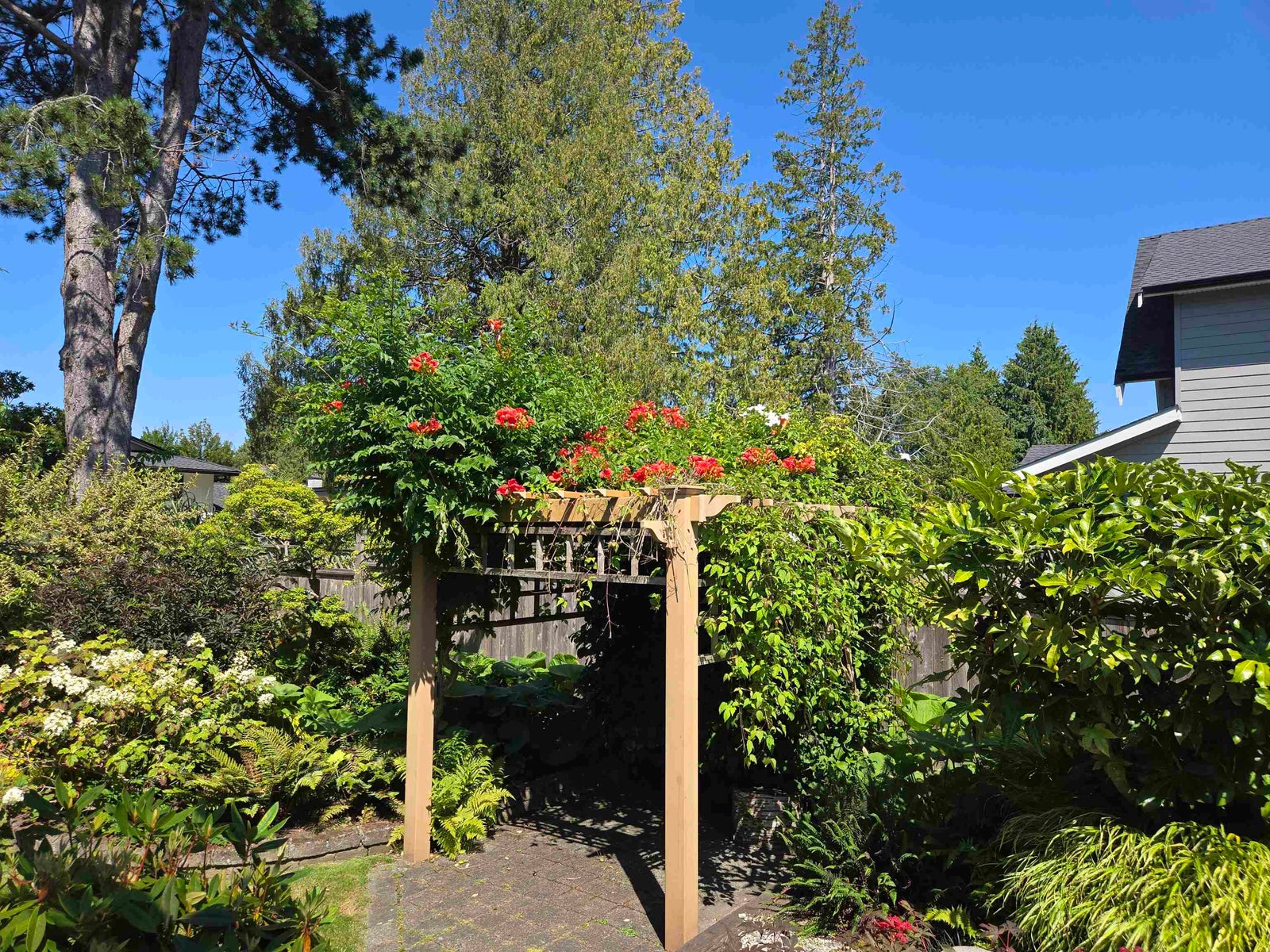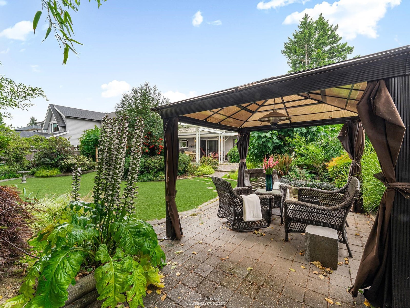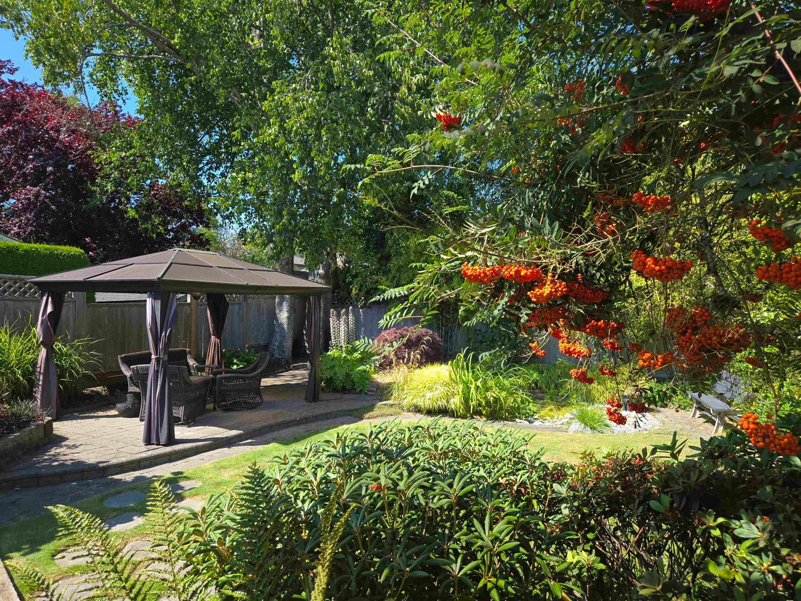 Beautiful updated rancher in Pebble hill area in Tsawwassen, this home offers the perfect blend of comfort & outdoor living. Situated on an expansive 8,900 sq ft lot with mature privacy hedging. The meticulously landscaped garden is a private oasis featuring multiple sitting areas, pergola & underground sprinkler system. The rear outdoor space is an entertainer's dream, complete w glass-covered patio, pergola, gazebo, outdoor kitchen & ample space for hosting family & friends. Step inside to a 3 bed home with an open concept living / dining & updated kitchen w thoughtful design. Hardwood flooring, cozy gas f/p, & skylights throughout create a bright & inviting atmosphere. Double garage + multiple storage areas! Steps from Diefenbaker Park!!! OPEN HOUSE Sun. 25th 2-4