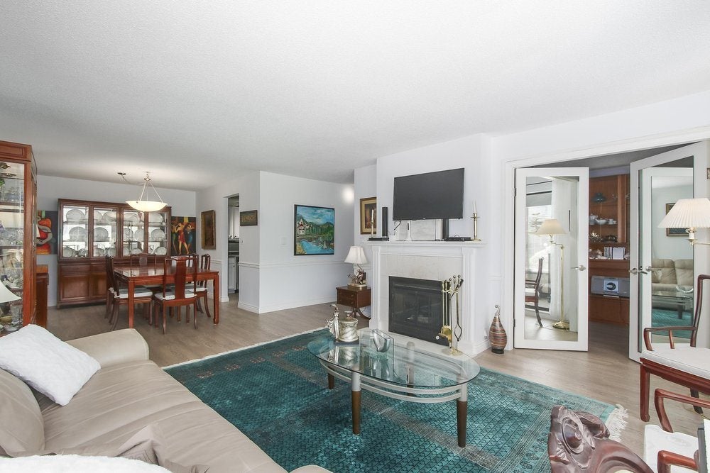 Beautiful, raised ground floor, S/E corner 2 bed/2 bath condo in SEARIDGE COURT with entry off the secured, shared courtyard and windows to the W,S. & E. This bright elegant home offers a large efficient kitchen, large master bed with ensuite, 2nd bed and bath, insuite laundry, gas f/p, window in kitchen and a spectacular solarium. The large dining room and living room, as well as the huge solarium offer amazing natural light from all windows facing E. & S. This shows beautifully. The building is very well cared for and boasts a lovely inner courtyard, storage lockers and secure underground parking. Only a short walk to shopping, transit, restaurants and the beach! 200 sq.ft. solarium not included in square footage! Wheelchair friendly. Age restricted 19+ building. No rentals allowed.