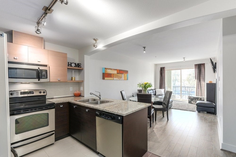 Zen at Salus! This bright 2 bedroom / 2 bathroom condo is west facing and filled with natural light. A beautiful floor plan, it has great flow with an open kitchen, full dining area & large living room, all looking onto a large patio. Both bedrooms are spacious; the master boasts a walk in closet & a full beautiful ensuite bath. In gorgeous condition, you will find stainless steel appliances, granite counters, stunning new flooring as well as new interior doors & master bath lighting (installed after photos taken). Walking distance to groceries, restaurants & shopping. Amazing resort like amenities include: club house, outdoor pool, large gym, massive shared roof deck, hot tub, yoga room, sauna & more. Call for your private appointment.